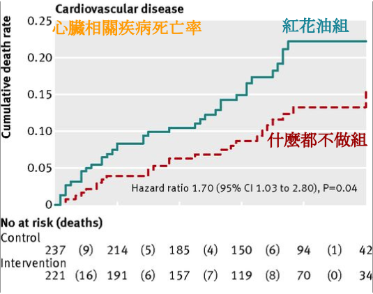 (紅花籽油組的心血管死亡率較高)