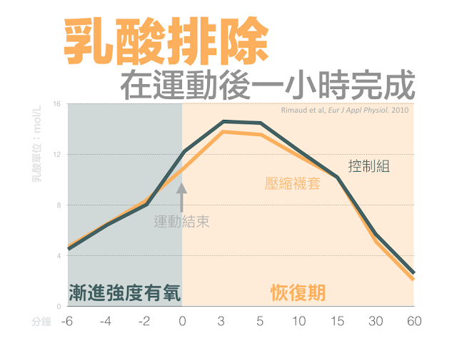 2010年針對8位耐力型運動員所做的研究顯示,運動後60分鐘不管有穿還是沒穿壓縮腿套,血液中的乳酸濃度都會回復到運動前的水準。